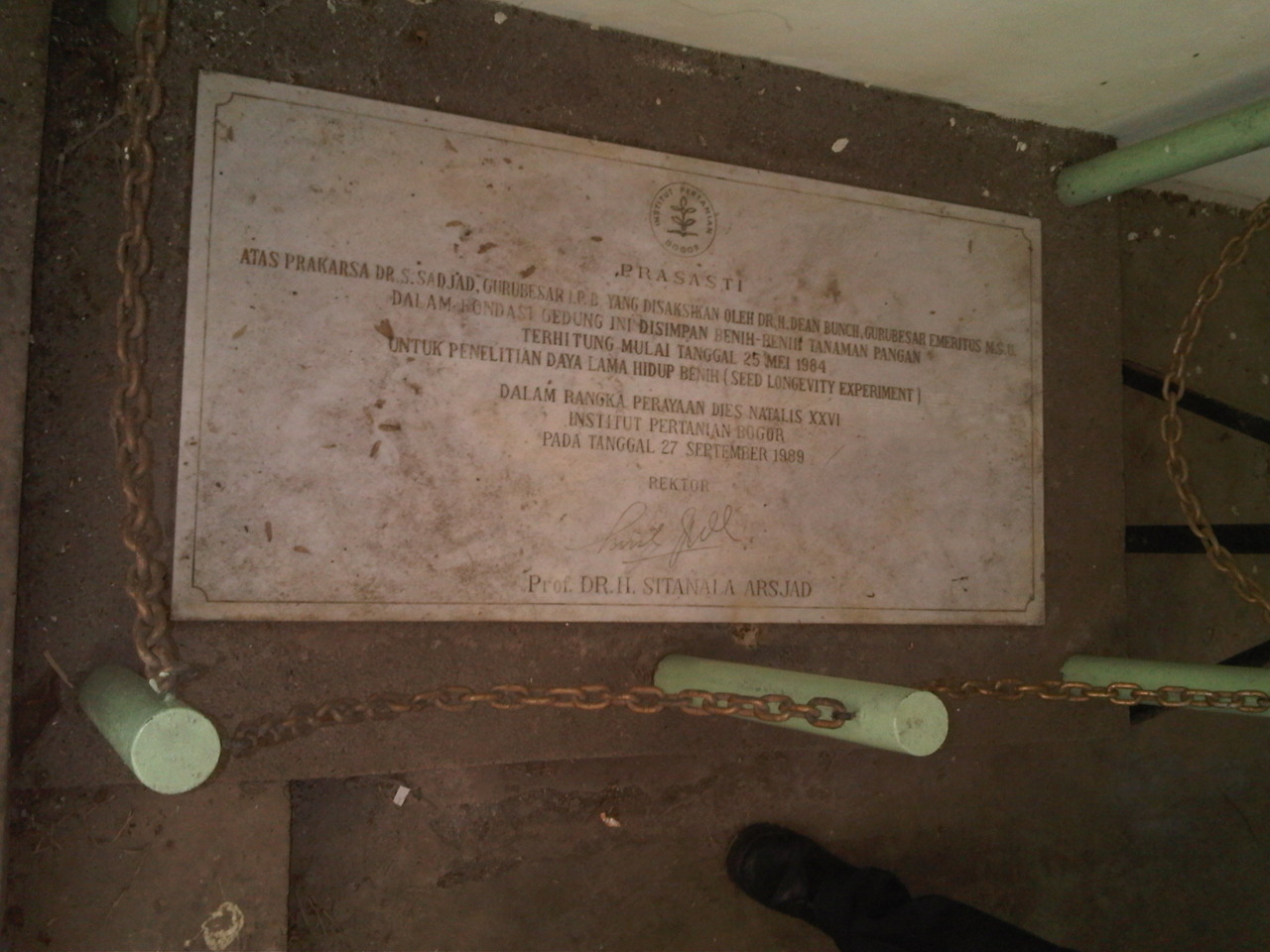 Hi IPB’ers. Tahukah kalian kalau di kampus kita tercinta ada prasasti? Walaupun nilainya belum sampai ratusan tahun tapi cukup menbanggakan karena prasasti kita merupakan salah satu penelitian IPB oleh salah satu dosen Agronomi Hortikultura. Penelitiannya bertemakan uji daya simpan dimana di dalam prasasti tersebut terdapat empat jenis biji diantaranya padi dan jagung beserta komoditas palawija lainnya yang disimpan dalam kotak kaca dan lapisan beton sejak tahun 1984 hingga rubungnya gedung tempat penyimpanannya. Jadi generasi ke berapakah benih yang tersimpan akan lanjut diteliti?